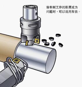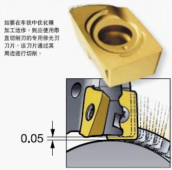 就粗加工工序而言,車銑不需要專用刀具;但若要優(yōu)化精加工工序,則應(yīng)使用專用的標(biāo)準(zhǔn)修光刃可轉(zhuǎn)位刀片。要使輕微的表面形狀偏差變圓滑,需要使用直的修光刃刀刃,而非用于一般銑削的常規(guī)弧形刀刃。在車銑運(yùn)動(dòng)中,切削點(diǎn)沿著生成表面的切削刃前后移動(dòng),而這意味著弧形刀刃可在直徑上造成更多的高度變化,從而加大扇形深度。