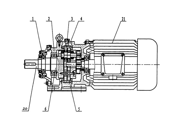 | 一種減速機(jī),電機(jī)(21)與針齒殼(4)聯(lián)接,針齒殼(4)與機(jī)座(2)聯(lián)接,其特征在于,空心行星架裝置(6)通過軸承設(shè)于機(jī)座(2)內(nèi),并與裝在針齒殼(4)內(nèi)的針齒銷(3)、擺線片(5)產(chǎn)生關(guān)聯(lián),太陽(yáng)輪(13)與電機(jī)(21)的電機(jī)軸(12)連接,輸出軸(20)和空心行星架(6)整合為一體延伸至機(jī)座(2)外。 |