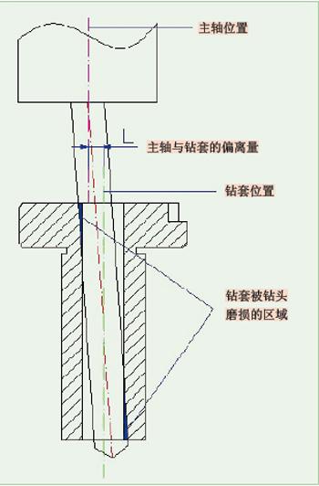 當(dāng)鉆套位置與主軸位置的同軸度較差時,鉆頭刀具加工一段時間以后會導(dǎo)致鉆套進、出口處的相對位置的局部磨損。如圖4所示,由于鉆頭刀具與鉆套不同軸,所以鉆頭在進入鉆套時就碰到了左邊的孔壁,這樣導(dǎo)致鉆頭的直線度變化。而鉆頭在繼續(xù)進給時,由于鉆頭與鉆套的配合間隙,又造成鉆頭在鉆套的出口處碰到鉆套的右邊,這樣加工中不僅僅是加工孔的垂直度不好,使用時間一長還導(dǎo)致鉆套的進出口孔壁出現(xiàn)相對的孔壁位置磨損。這種現(xiàn)象開始的時候加工孔還在工藝允許要求范圍之內(nèi),但是時間一久,加工孔的位置度就會出現(xiàn)超差現(xiàn)象,因此,只能采用更換鉆套的方法來滿足加工孔的位置度要求。