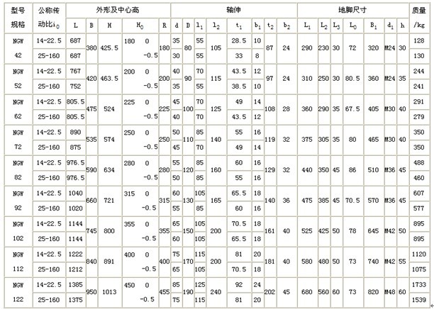 NGW型行星齒輪減速機(jī)主要構(gòu)建有太陽(yáng)輪、行星輪、內(nèi)齒圈、行星架。 具有一下特點(diǎn): 1、體積小、重量輕、在相同情況下,比普通漸開線圓柱齒輪減速機(jī)重量輕1/2以上,體積小1/2~1/3。 2、傳動(dòng)效率高:?jiǎn)渭?jí)行星齒輪減速機(jī)達(dá)97%~98%;兩級(jí)行星齒輪減速機(jī)達(dá)94%~96%;三級(jí)行星齒輪減速機(jī)91%~94%。 3、傳動(dòng)功率范圍大:可以從小于1KW至1300KW,甚至更大。 4、傳動(dòng)范圍大:i=2.8~2000 5、適應(yīng)性強(qiáng)且耐用。 特點(diǎn)和適用范圍 結(jié)構(gòu)特點(diǎn) NGW型行星齒輪減速機(jī)主要構(gòu)建有太陽(yáng)輪、行星輪、內(nèi)齒圈、行星架。 為了使三個(gè)行星輪的載荷均勻分配,采用了齒式浮動(dòng)機(jī)構(gòu),即太陽(yáng)輪或行星架浮動(dòng),或者太陽(yáng)輪、行星架兩者同時(shí)浮動(dòng)。減速機(jī)中的齒輪為直齒漸開線圓柱齒輪。具有一下特點(diǎn): 1、體積小、重量輕、在相同情況下,比普通漸開線圓柱齒輪減速機(jī)重量輕1/2以上,體積小1/2~1/3。 2、傳動(dòng)效率高:?jiǎn)渭?jí)行星齒輪減速機(jī)達(dá)97%~98%;兩級(jí)行星齒輪減速機(jī)達(dá)94%~96%;三級(jí)行星齒輪減速機(jī)91%~94%。 3、傳動(dòng)功率范圍大:可以從小于1KW至1300KW,甚至更大。 4、傳動(dòng)范圍大:i=2.8~2000 5、適應(yīng)性強(qiáng)且耐用。主要零件均采用優(yōu)質(zhì)合金鋼經(jīng)滲碳淬火或氮化處理,行星齒輪減速機(jī)運(yùn)轉(zhuǎn)平穩(wěn)、噪音小、使用受命10以上。 6、用途和適用條件 NGW型行星齒輪減速器有單級(jí)(NGW11—NGW121),兩級(jí)(NGW42—NGW122)三級(jí) (NGW73—NGW123)三個(gè)臥式系列。主要用于冶金、礦山、起重運(yùn)輸機(jī)械設(shè)備,也可用于其它類似工礦條件下作動(dòng)力傳動(dòng)。 高速軸最高速不超過(guò)1500r/min 齒輪圓周速度不超過(guò)10m/s; 工作環(huán)境溫度為-40℃—45℃; 可正反兩向運(yùn)轉(zhuǎn)。 NGW型行星齒輪減速器的一個(gè)重要特點(diǎn)是,內(nèi)嚙合于外嚙合之間共用一個(gè)行星輪,NGW就是由“內(nèi)、公、外”三字的漢語(yǔ)拼音的第一個(gè)字母組成的。