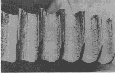 通常,當(dāng)齒輪齒根厚度與齒寬相比顯得小時(shí),斷口面上就會(huì)出現(xiàn)人字形。