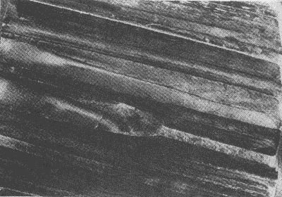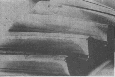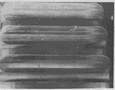 輪齒的滾壓塑變。圖為一從動(dòng)齒輪,其齒面上工作節(jié)曲面附近明顯的隆起清晰可見(jiàn)。
