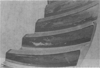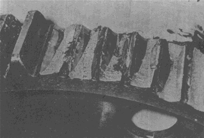 在這幾個(gè)輪齒上由于齒輪傳遞的載荷集中于靠近一端的一小部分齒面上,因而造成齒面嚴(yán)重點(diǎn)蝕,從而導(dǎo)致其下一輪齒疲勞折斷。