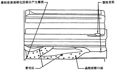 由于裂紋通常在表層與心部的過(guò)渡區(qū)延伸,致使大塊表層材料碎片逐漸脫落。