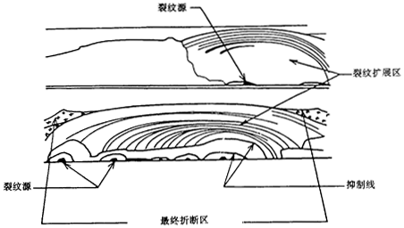 斷口面分為兩個(gè)不同的區(qū)域,疲勞斷口面和最終斷口面。在疲勞區(qū)內(nèi)看不到塑性變形痕跡,斷口面平滑、無(wú)光澤,有時(shí)由于被抑制線(xiàn)分割,可顯現(xiàn)出裂紋擴(kuò)展各連續(xù)階段的間隔區(qū)。