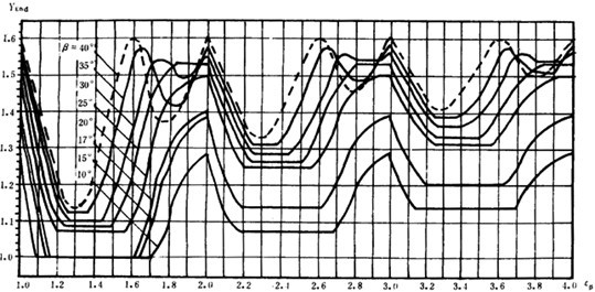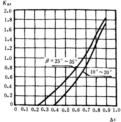 接觸跡系數(shù)是考慮重合度尾數(shù)Δε對(duì)輪齒應(yīng)力的影響系數(shù)。當(dāng)Δε較大時(shí),在相應(yīng)于Δε的齒寬部分,即使在最不利的情況下,也有部分接觸跡參與承擔(dān)載荷,使輪齒應(yīng)力有所下降。推薦Δε=(0.25~0.4)。KΔε值可按Δε由圖3查取。當(dāng)齒端修薄時(shí),應(yīng)根據(jù)減去齒端修薄長(zhǎng)度后的有效齒長(zhǎng)部分的Δε來查圖(當(dāng)20°<β°<25°時(shí),采用插值法查。