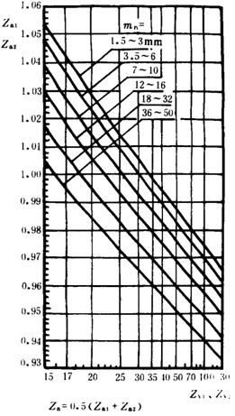 接觸弧長(zhǎng)系數(shù)是考慮齒面接觸弧的有效工作長(zhǎng)度對(duì)齒面接觸應(yīng)力影響的系數(shù)。當(dāng)齒數(shù)比不等于1時(shí),一個(gè)齒輪的上齒面和下齒面的接觸弧長(zhǎng)不一樣。接觸弧長(zhǎng)系數(shù)應(yīng)取兩個(gè)齒輪的平均值,即Za=0.5(Za1+Za2),Za1和Za2值可按小齒輪和大齒輪的當(dāng)最齒數(shù) 和 查圖6。