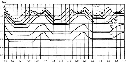 齒端系數(shù)是考慮接觸跡在齒輪端部時(shí),端面以外沒有齒根來參與承擔(dān)彎曲力矩,以致端部齒根應(yīng)力增大的影響系數(shù)。對(duì)于未修端的齒輪,YEnd值可根據(jù)εβ(εβ=b/Px)由圖8查。ó(dāng)β不是圖中值時(shí),用插值法查。。