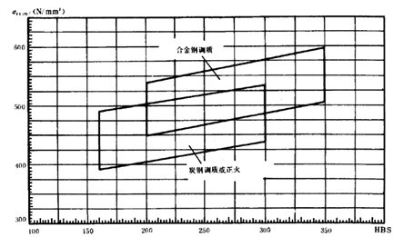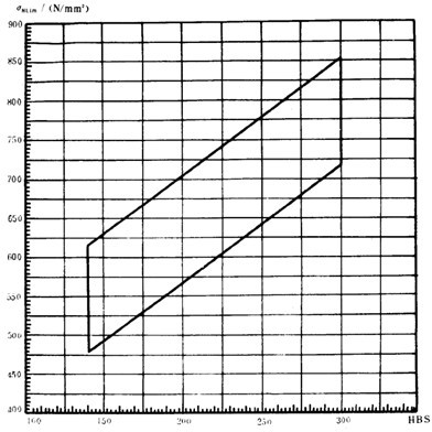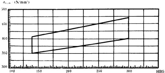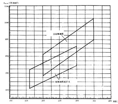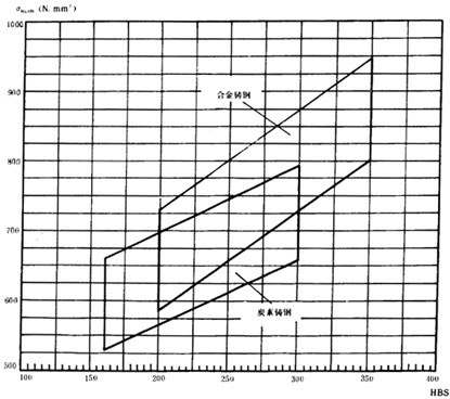 疲勞極限是指某種材料的齒輪經(jīng)長(zhǎng)期持續(xù)的重復(fù)載荷(接觸應(yīng)力循環(huán)基數(shù)No=5×107,彎曲應(yīng)力循環(huán)基數(shù)No=3×106)作用后,輪齒保持不破壞時(shí)的極限應(yīng)力。它可由齒輪的負(fù)荷動(dòng)轉(zhuǎn)試驗(yàn)或經(jīng)驗(yàn)統(tǒng)計(jì)數(shù)據(jù)獲得。當(dāng)缺乏資料時(shí),可參考圖10和圖11,根據(jù)材料和齒面硬度取值。鑄鋼、氮化鋼和球墨鑄鐵的疲勞極限見附錄A(補(bǔ)充件)。