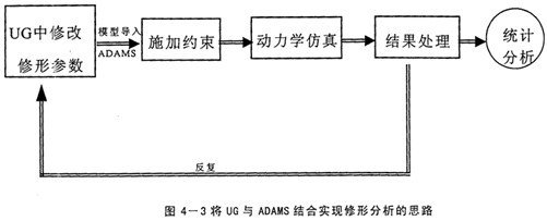前面已經(jīng)以擺線傳輸線的參數(shù)化建模為例,闡述了UG的強大的基于特征的參數(shù)化造型功能,既然用子程序的方式實現(xiàn)不了,將UG的該功能加以充分利用,也可以實現(xiàn)優(yōu)化修形的目的。實現(xiàn)的途徑是在建造擺線輪的表達式中考慮修形量△Rz與△r,這樣就建造了修形后的擺線輪,同時△Rz與△r是隨機可調(diào)的變量,可以得到任意組合的修形方式。并且UG的數(shù)據(jù)存儲具有單一數(shù)據(jù)庫的特點,零件圖中修改后,裝配圖及工程圖全都自動更新,不用人工去費時修改。然后,再將總裝配模型導(dǎo)入到ADAMS中施加約束。執(zhí)行仿真。這樣就得到多組修形組合的仿真結(jié)果,經(jīng)過統(tǒng)計分析就可得到最佳的修形組合。具體思路如下圖所示。