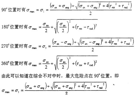 此時(shí)的應(yīng)力情況屬于三向應(yīng)力狀態(tài),所以其分析過程和徑向不對中900以及2700情況相似,只是這里還有了附加的軸向拉應(yīng)力和附加的角向應(yīng)力,將各個(gè)應(yīng)力值