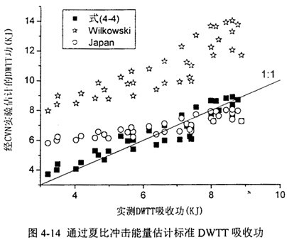 圖4-19顯示了標(biāo)準(zhǔn)壓制缺口DWTT試樣能量與實驗溫度數(shù)據(jù)。