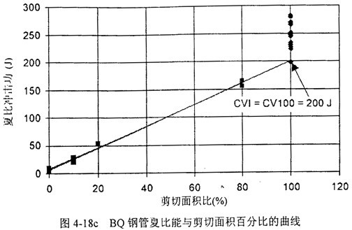 圖4-18a,b,c給出了三家鋼管的夏比能與剪切面積的關(guān)系,以及85%剪切面積對應(yīng)的轉(zhuǎn)變溫度。圖中CV100表示100%剪切面積時最低的夏比能,CVI表示最低夏比平臺能,也稱夏比轉(zhuǎn)變能,CVP表示夏比平臺能。菱形實驗點表示剪切面積高于90%,方形實驗點表示低于90%可以看到,剪切面積低于90%時,夏比能與剪切面積呈線性關(guān)系。