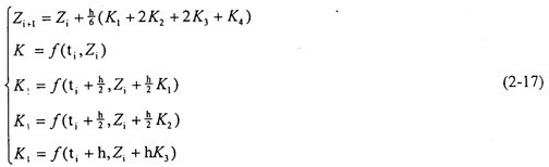 由于上式是一個(gè)非線性時(shí)變方程組,它的理論解無(wú)法得出,故采用數(shù)值解法求解。為了便于計(jì)算,將方程組(2-15)轉(zhuǎn)化到狀態(tài)空間中,將方程組表達(dá)成: