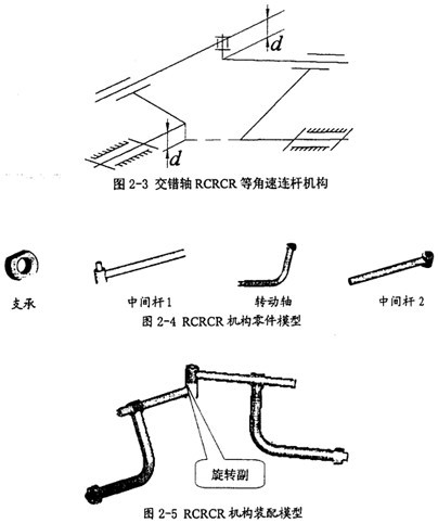 若一個機構在運轉時其位形始終具有以軸交角(輸人軸和輸出軸之間的夾角)的角平分面為鏡面的對稱性,則該機構將具有等角速性。顯然,運動副與構件均對稱于上述鏡面且含有中間副的單自由度鏡面機構是這類機構的基本型式,其運動特征是,中間運動副始終在鏡面內作平面運動。這一理論直觀地闡明了一般相交軸、交錯軸等角速連桿機構的基本型式。