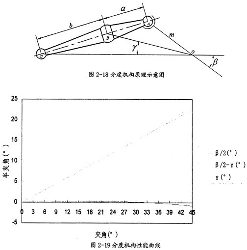 ,y的函數圖形,在β角小于36度以前,幾乎是重疊的,在36度以后,才開始有明顯的差異,這一點從它們的差值曲線(圖2-19中下面的紫紅色曲線)也可以看出。這就是說,此機構在目前的尺度下在36度以前,它的分度性能是相當理想的,值得借鑒。不過從分度性能曲線上,可以看出,環(huán)叉式萬向聯(lián)軸器并非是完全的等角速萬向聯(lián)軸器,因為在36度以前的分度也有微小的差異。