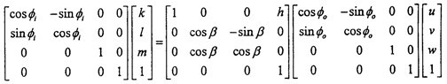 十字軸萬向聯(lián)軸器的機構實際上是球面四連桿機構,它的空間運動關系早已解析出。當輸入、輸出兩軸線的夾角為β輸入軸轉角ф