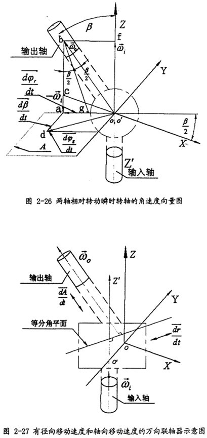 如圖2-28所示,輸入軸與輸出軸通過一個萬向聯(lián)軸器J聯(lián)接,兩軸夾角β為變量,輸出軸相對于輸入軸存在瞬時轉動——滑動軸,用矢量