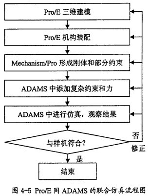 在仿真中如果發(fā)現(xiàn)結(jié)果不對,則我們需要對前面的模型進(jìn)行修正,然后再做仿真分析,直到結(jié)果正確。決而言之利用Pro/E和ADAMS進(jìn)行聯(lián)合仿真,其基本的步驟如圖4-5所示。