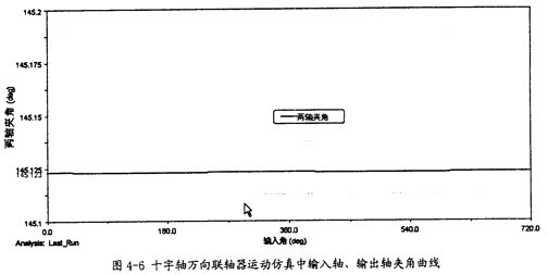由圖4-10可以知道,輸入軸同輸出軸的夾角在三叉桿式萬向聯(lián)軸器運(yùn)轉(zhuǎn)時(shí)是不斷變化的,在每一個(gè)回轉(zhuǎn)周期中,它的變化頻率為3次,這證明了這種聯(lián)軸器是一種非定心式萬向聯(lián)軸器,同時(shí)在一定的程度上驗(yàn)證了三叉桿式三軸頸的交點(diǎn)以三倍于萬向聯(lián)軸器的轉(zhuǎn)速作圓周運(yùn)動的理論的正確性。另外還可看出盡管夾角在不斷變化,但變化非常小,對兩軸的夾角大小影響很小,本次仿真中夾角大小平均是164.32°(其補(bǔ)角為15.7°,即是第三章中理論計(jì)算中的角度之一)。