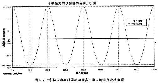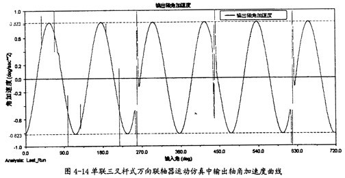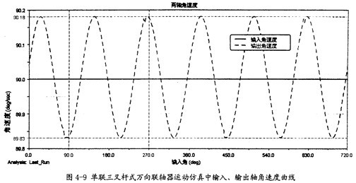 由圖4-9可以知道,當(dāng)輸入軸轉(zhuǎn)速恒定為90o/s時(shí),輸出軸并不作恒速轉(zhuǎn)動,而是以90o/s為中心,作非常有規(guī)律的周期性運(yùn)動,在每一個(gè)回轉(zhuǎn)周期中,它的變化頻率為3次。這里的結(jié)果同第三章中的曲線圖3-8也是完全吻合的,因此在一定的程度上也證明了三叉桿萬向聯(lián)軸器轉(zhuǎn)速分析理論的正確性。