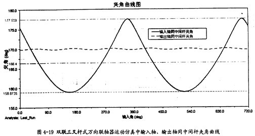 由圖4-20可以看出,中間桿同輸出軸間的夾角變化也呈現(xiàn)一定的規(guī)律,在每-個(gè)回轉(zhuǎn)周期中,它的變化頻率為3次。結(jié)合圖4-19、圖4-20可知中間桿同輸入軸及輸出軸夾角的變化頻率是不-樣的,這是雙聯(lián)三叉桿式萬向聯(lián)軸器有別于單聯(lián)三叉桿式萬向聯(lián)軸器的一種特性。