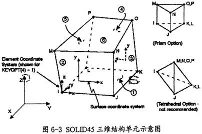此單元為3-D固體結(jié)構(gòu)單元,由八個節(jié)點組成,在單元的每一節(jié)點上有三個自由度,即分別沿著三個坐標(biāo)軸的方向。此單元可以進(jìn)行塑性、蠕變、應(yīng)力硬化、大變形以及大應(yīng)變分析,是結(jié)構(gòu)分析中的最常用單元。單元結(jié)構(gòu)如圖6-3,此單元有兩種退化形式(見圖6-3右邊)。