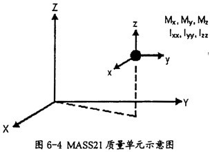 此單元為一個有六自由度的質(zhì)量單元。此單元的第一個不同的坐標(biāo)方向上可以施加不同的質(zhì)量大小和轉(zhuǎn)動慣量。質(zhì)量單元是由單個節(jié)點、單元坐標(biāo)方向的集中質(zhì)量系數(shù)、單元坐標(biāo)軸的旋轉(zhuǎn)慣性所決定的。為了在加入質(zhì)量單元后不影響系統(tǒng)的慣性屬性,在此單元的實常數(shù)設(shè)定中慣性量應(yīng)設(shè)定的非常。ㄈ缧∮10-4)。單元如圖6-4所示。