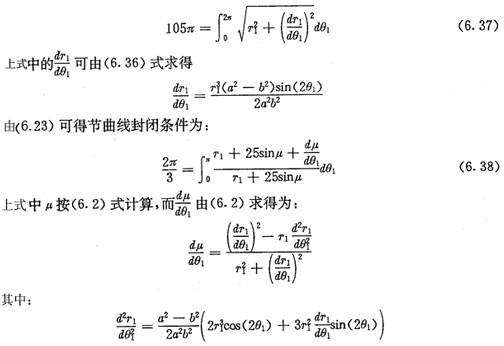 從以上設(shè)計(jì)過(guò)程可以看出,根據(jù)非圓太陽(yáng)輪設(shè)計(jì)行星輪為圓的純滾動(dòng)非圓行經(jīng)齒輪傳動(dòng)機(jī)構(gòu)時(shí),并不是對(duì)任意指定的太陽(yáng)輪節(jié)曲線都有解。當(dāng)太陽(yáng)輪節(jié)曲線的周期數(shù)n1給定后,節(jié)曲線必須有兩個(gè)可調(diào)整的參數(shù)(例中的a和b)的要由節(jié)曲線的封閉條件及輪齒等分條件來(lái)確定。齒輪模數(shù)m和太陽(yáng)輪齒數(shù)z1是被預(yù)先指定了的。當(dāng)各參數(shù)求出后,要用不干涉條件(6.28)式進(jìn)行校驗(yàn),若發(fā)生干涉,應(yīng)調(diào)整z1數(shù)值,重新計(jì)算太陽(yáng)輪的可調(diào)整參數(shù)。