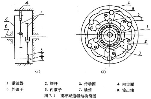 圖7.1所示為擺桿減速器的結(jié)構(gòu)簡(jiǎn)圖。擺桿減速器也由四大部分組成:激波器1;擺動(dòng)機(jī)構(gòu)(包括擺桿2,內(nèi)滾子6, 外滾子5和軸銷7);傳動(dòng)圈3 以及與其固聯(lián)的輸出軸8;內(nèi)齒圈4?梢钥闯,除了擺動(dòng)機(jī)構(gòu)外,其它構(gòu)成與推桿減速器類似。也采用了兩套完全相同且互成180°的激波器及內(nèi)齒圈以實(shí)現(xiàn)輸出的靜平衡和提高嚙合效率。
