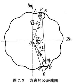 如圖7.9所示,AB是其中一個(gè)齒槽的一側(cè)齒廓,A′B′是跨教為K(圖中K=5)的一個(gè)齒槽的另一側(cè)齒廓。設(shè)內(nèi)齒圈的齒廓曲線在圖示坐標(biāo)系下可用方程式(7.9)來表示,現(xiàn)在來求齒廓AB及齒廓A′B′上具有的公法線。