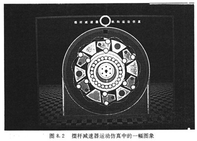 根據(jù)上述基本設(shè)計(jì)參數(shù)及各零部件的結(jié)構(gòu)參數(shù),將各主要運(yùn)動(dòng)部件的工作過(guò)程在計(jì)算機(jī)屏幕上動(dòng)態(tài)顯示出來(lái)。圖8.2是動(dòng)態(tài)仿真過(guò)程中的一幀圖象。計(jì)算機(jī)仿真結(jié)果與理論分析完全一致。