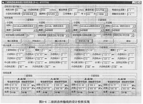 c、輪齒疲勞強(qiáng)度及其修正系數(shù)(ZNT、YNT、ZL、Zv、ZR、Zx、Yx、Yδreit、YRreIT)在這三類參數(shù)中,用戶參數(shù)是要由用戶給定,齒輪特性參數(shù)是要得到的結(jié)果,齒輪設(shè)計(jì)參數(shù)是一種中間描述參數(shù),它需要通過一系列的復(fù)雜的計(jì)算求解,而齒輪設(shè)計(jì)的科學(xué)性也就是通過對(duì)齒輪設(shè)計(jì)參數(shù)的精確確定而實(shí)現(xiàn)的,具體計(jì)算機(jī)實(shí)現(xiàn)公式見3.6-3.8;齒輪的接觸強(qiáng)度與彎曲強(qiáng)度校核分別見3.3和3.4。系統(tǒng)的參數(shù)初始輸入界面見圖3-3。