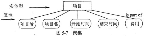 2、聚集(Aggregatopm):定義某一類型的組成部分。她抽象了對(duì)象內(nèi)部類型和成分之間“is part of”的語(yǔ)義。在E-R模型中若干屬性的聚集組成了實(shí)體的就這種抽象。如圖5-7。