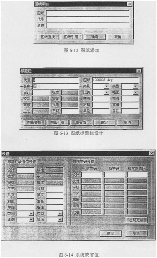 根據(jù)相應(yīng)項的密碼輸入,再選擇/添加/刪除產(chǎn)品,見圖6-10,進(jìn)行圖紙管理系統(tǒng)的主畫面(見圖6-11),進(jìn)而對產(chǎn)品選擇、圖紙進(jìn)行添加、刪除(圖6-12)及其編輯,明細(xì)表、標(biāo)題欄的設(shè)計(圖6-13)以及一些系統(tǒng)缺省值(圖6-14)的固定等等;