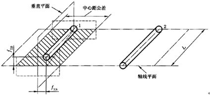 “軸線平面內(nèi)的偏差” f∑δ是在兩軸線公共平面上測量的,這公共平面是用兩軸承跨距中較長的一個(gè)L和另一根軸上的一個(gè)軸承來確定的,如果兩個(gè)軸承的跨距相同,則用小齒輪軸和大齒輪軸的一個(gè)軸承!按怪逼矫嫔系牡钠睢 f∑δ是在與軸線公共平面相相垂直的“交錯(cuò)軸平面”上測量的。