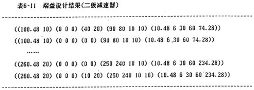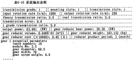 圓柱齒輪減速器設(shè)計(jì)完成后,其結(jié)果為一系列表(LISP 語言形式)組成的結(jié)果。為了使專家系統(tǒng)的結(jié)果方便地被用戶所理解,系統(tǒng)設(shè)置有相應(yīng)的輸出函數(shù),并以表格的形式,輸出所需的設(shè)計(jì)數(shù)據(jù)。下表(表6-16 )為專家系統(tǒng)設(shè)計(jì)的一一級圓柱齒輪減速器的示例。
