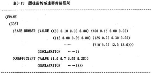 1.圓柱齒輪減速器價格主要考慮齒輪材料、精度,減速器中心距,總重量等因素,如表6-14。專家系統(tǒng)設(shè)計(jì)中,可用框架表示(表6-15 ):