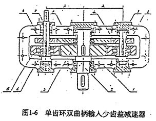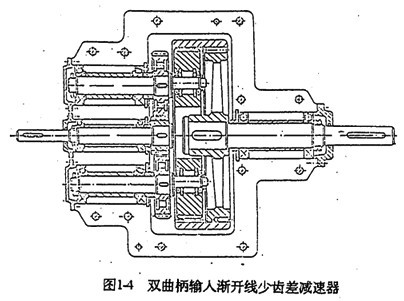 雙曲柄機(jī)構(gòu)中,如果在兩根曲軸上都有動(dòng)力輸入,則“死點(diǎn)”位置也就自然不存在了。因此,可以通過一套定軸傳動(dòng)機(jī)構(gòu)把動(dòng)力從一輸入高速軸傳遞到另一高速軸,從而克服機(jī)構(gòu)“死點(diǎn)”。根據(jù)這種原理制成的雙曲柄輸入少齒差行星齒輪裝置之不理的類型很多,如太原工學(xué)院五十年代研制的雙曲柄輸入漸開線少齒差減速器(見圖1-4)、英國(guó)專利(見圖1-5)、、重慶鋼鐵公司研制的單齒環(huán)雙曲柄輸入少齒差減速器(見圖1-6)、日本松本和幸等人研制的RV減速器(見圖1-7)。其特點(diǎn)都是通過外嚙合齒輪副將輸入動(dòng)力分流、傳遞到多個(gè)曲柄軸上,形式多軸輸入,從而克服“死點(diǎn)”。這種結(jié)構(gòu)的特點(diǎn)是其傳動(dòng)比為定軸傳動(dòng)的傳動(dòng)比與少齒差行星齒輪傳動(dòng)的傳動(dòng)比之乘積,因而可以通過改變外嚙合齒輪的齒數(shù)方便函地滿足不同傳動(dòng)比的要求,適應(yīng)性強(qiáng)。其不足之處是結(jié)構(gòu)復(fù)雜,而且在高速軸之間存在兩平行傳動(dòng)的剛性傳動(dòng)鏈(外齒輪嚙合副和雙曲柄機(jī)構(gòu))對(duì)誤差比較敏感,加工精度要求很高。