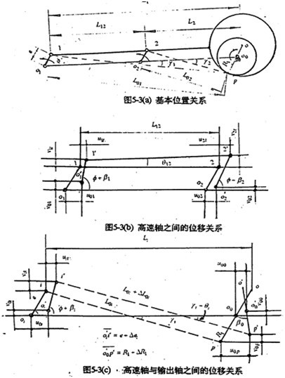 三環(huán)減速是多相并列連桿行星齒輪傳動過約束機(jī)構(gòu)。應(yīng)該從整體系統(tǒng)上去考慮其變形關(guān)系。圖5-3是一相子機(jī)構(gòu)的位移關(guān)系圖。圖5-3(a)是基本位置圖、圖5-3(b)是高速軸之間的位移關(guān)系、圖5-3(c)是高速軸與輸出軸之間的位移關(guān)系(i=1、2)。由圖寫出各運(yùn)動副中心的位移關(guān)系如下: