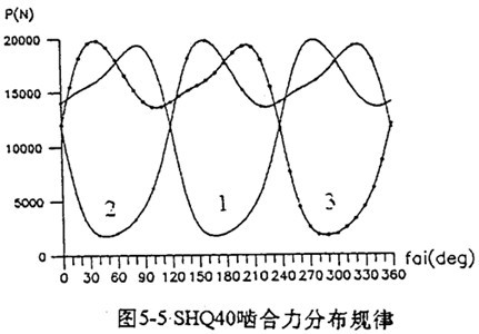 SHQ40型三環(huán)減速器的嚙合力隨φ的變化規(guī)律如圖5-5所錄。由圖可以看出嚙合力的以下規(guī)律: