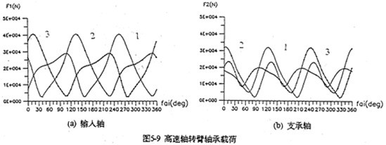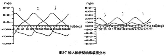 4.輸出軸的行星軸承總體載荷比支承軸行星軸承總體載荷大(圖5-9),特別是輸入軸X方向受力最大。輸入軸行星軸承載荷在死點(diǎn)附近取得最小值,在φ=105°、255°取得極大值。極大值產(chǎn)生的位置正好是機(jī)構(gòu)傳動角最佳位置附近。在同一時刻,齒板上各輸入軸行星軸承的受力狀況是不是一樣的。當(dāng)某一齒板接近其死點(diǎn)位置時,軸承載荷較小,而同時另外兩片遠(yuǎn)離死點(diǎn)位置的齒板上輸入軸行星軸承載荷要大得多。支承軸的軸承載荷在一個周期內(nèi)分別出現(xiàn)三次極大值和三次極小的值。由于這個原因使支承軸偏心套的微動磨損比輸入軸偏心套的微動磨損更為嚴(yán)重。行星軸承載荷的最大值為