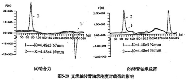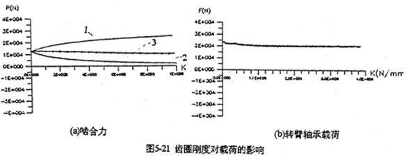 只考慮行星軸承變形及齒板變形時,影響三環(huán)減速器載荷特性的剛度,主要是行星軸承剛度、和內(nèi)齒圈的變形剛度。軸承剛度與軸承材料、間隙、油膜等很多因素有關(guān)。圖5-19是輸入軸行星軸承剛度對嚙合力及行星軸承載荷的影響。當(dāng)輸入行星軸承剛度小一個數(shù)量級時,負(fù)向嚙合力區(qū)域增大(見圖5-19a);隨剛度減小、各相嚙合力越不均恒(圖5-19b),輸入軸行星軸承剛度的影響比輸入軸行星軸承剛度更大,見圖5-20所示。嚙合力及各行星軸承載荷在軸承剛度較小的情況時,都出現(xiàn)正常載荷的10倍以上的沖擊現(xiàn)象,沖擊產(chǎn)生的位置隨剛度變化不同。內(nèi)齒圈剛度對載荷的影響與行星軸承剛度相反(見圖5-21所錄)。當(dāng)剛度越小時,三相齒板的嚙合力越均恒(見圖5-21a),而且行星軸承載荷幅值基本上不變(見圖5-21b)。同此可推知,減小三環(huán)減速器振動的途徑之一就是提高行星軸承剛度,減小內(nèi)齒圈剛度。這可以通過對行星軸承進(jìn)行預(yù)緊,和采用軟齒面或大柔度齒圈的辦法,以使嚙合力和行星軸承載荷均衡化,以達(dá)到減振降噪的目的。