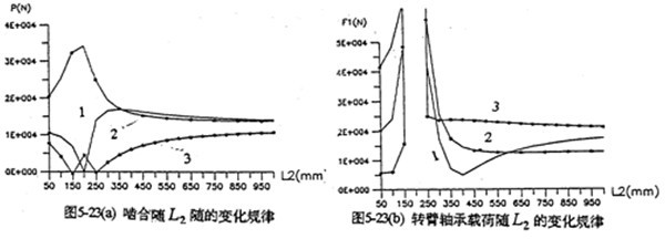 支承軸的位置L2變化的載荷分布規(guī)律與輸入軸位置L1變化的載荷分布規(guī)律相似(見圖5-23所示),但當(dāng)L2后各相載荷之間的幅值差比L1變化時要小很多,故各相之間的載荷分配比較均衡。這是因為L2> L1=200mm以后,減速器為中軸輸入。中軸輸入時,無論是嚙合力還是軸承載荷的分布特性都較好。各相載荷分配也比較均衡。