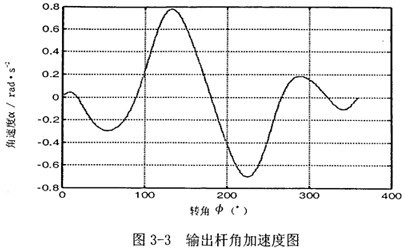 首先由圖3-2可以看到,若機(jī)構(gòu)結(jié)構(gòu)參數(shù)設(shè)計(jì)恰當(dāng),并且調(diào)整中間滑塊3偏移到合適的位置時(shí),可在一定范圍內(nèi),產(chǎn)生一個(gè)反向的速度波適度抵消原速度波動(dòng)。再由圖3-3可知,在未加入第二自由度時(shí),加速度變化值不大,說(shuō)明阻力矩和電機(jī)主動(dòng)力矩不會(huì)受到大的影響,不致導(dǎo)致原機(jī)械系統(tǒng)的各項(xiàng)參數(shù)發(fā)生大的變化。