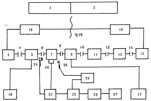 試驗時,通過控制臺1,2調(diào)節(jié)控制系統(tǒng)讓交直流機組18發(fā)出適當?shù)闹绷麟妷菏怪绷鳒y功機3(工作于恒速電動工況)按恒定轉(zhuǎn)速轉(zhuǎn)動,通過聯(lián)軸器4,6和輸入轉(zhuǎn)速扭矩傳感器5與試件7輸放端(高速端)相聯(lián)接。試件7輸出端通過聯(lián)軸器8,10,12,14及輸出扭矩傳感受器9、升速用11、汽車變速箱13而與直流測功機15(工作于恒電流工況)聯(lián)接,驅(qū)使其發(fā)出適當電壓的直流電,再通過交直流機組19將其逆變成為工頻北流電返回電網(wǎng),完成整個電功率封閉閉鏈。