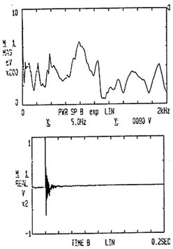 試件7上的振動信號與脈沖激勵的響應(yīng)信號通過傳感器20取出信號,然后經(jīng)過放大器21放大后,用磁帶記錄儀22記錄并可采用頻譜分析儀23監(jiān)控并分析,而其上的噪聲信號可以通過聲強儀25的測頭26取出信號后送入22和23中用于分析研究。