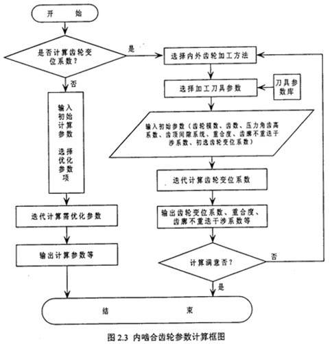 在少齒差內(nèi)嚙合傳動中,變位系數(shù)的確定是設(shè)計的關(guān)鍵。齒輪的實際幾何尺寸與齒輪的加工方法有直接的關(guān)系,所以用不同的齒輪加工方法的計算公式來推導變位系數(shù)的迭代公式,所得迭代結(jié)果不一樣。內(nèi)嚙合齒輪參數(shù)計算模塊中,已經(jīng)由公式(2.5 )~(2.9 )推導了少齒差內(nèi)嚙合傳動的各種實際加工情況下的變位系數(shù)的計算迭代公式,圖(2.3)為齒輪變位系數(shù)計算框圖。