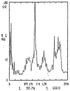 有了脈沖激勵(lì)信號(hào)和脈沖響應(yīng)信號(hào)后,CF-355頻譜分析儀就能計(jì)算出測(cè)點(diǎn)12X向由于14點(diǎn)X向激勵(lì)間的頻響函數(shù)H(ω)及其相干函數(shù),如圖4-5所示。圖4-6是頻響函數(shù)H(ω)的倒數(shù)。