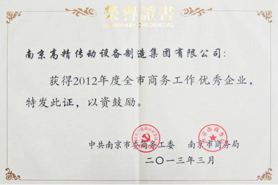 2013年3月15日,南京市政府在市級機關(guān)大禮堂召開全市商務(wù)工作會議,全面總結(jié)2012年全市商務(wù)工作,部署2013年商務(wù)工作目標任務(wù)。南京高精傳動設(shè)備制造集團有限公司(以下簡稱:南高齒)因成績突出被授予2012年度全市商貿(mào)工作優(yōu)秀企業(yè)稱號。